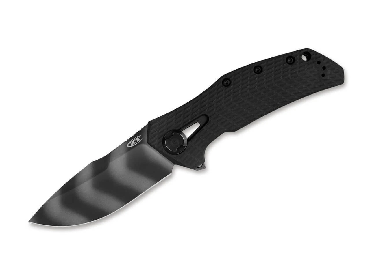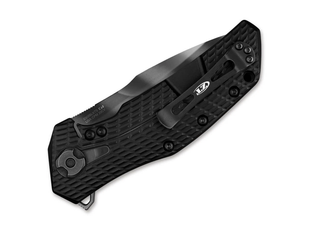 Zum ersten Mal überhaupt kombiniert Zero Tolerance ein schwarz-oxidiertes BlackWash-Finish mit seinem klassischen Tigerstreifenmuster. Das 0308BLKTS überzeugt mit seiner wuchtigen Tigerstripe-Klinge aus pulvermetallurgischem CPM 20CV-Klingenstahl und öffnet per Flipper. Der 3D-gefräste Griff des Framelock Folders besteht aus schwarzem G10 auf der Vorderseite und einem Titanrücken, was in dieser Kombination außerordentlichen Halt verspricht. Mit Fangriemenöse und Clip (Tip-up/r). Made in USA.