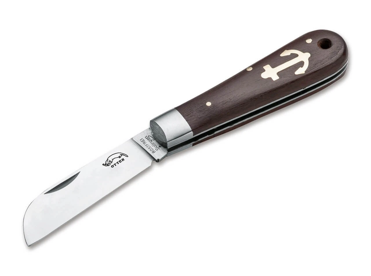 Ein echter Klassiker und Bestseller im Otter-Programm. Das Modell beeindruckt durch die typisch solide Bauweise und die maritime Anmutung durch die von Hand eingelegte Messingintarsie in Form eines Ankers. Ein traditionelles Taschenmesser, das durch die ständige Benutzung eine wunderschöne Patina erhält und durch seine abgerundeten Griffschalen wie ein Handschmeichler wirkt. Die Griffschalen bestehen aus edlem Grenadillholz und die rostfreie Klinge mit der für Solingen typischen Pließt-Oberfläche (manuelles Bandschleifen) aus bestem Solinger Stahl.