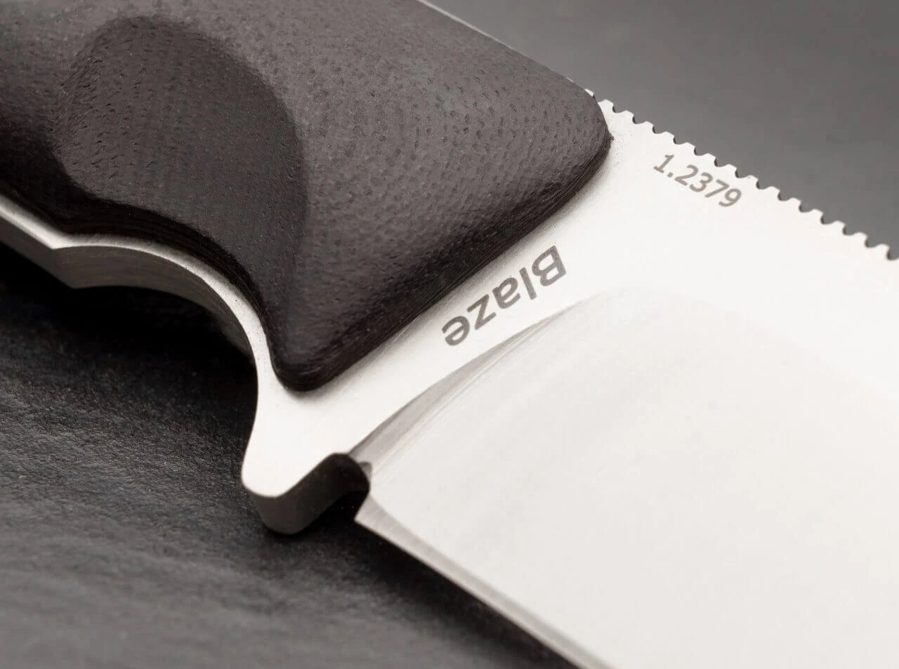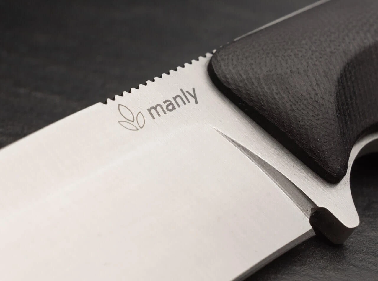 Das Manly Blaze Black ist ein stabiles Jagd- und Outdoormesser, das auch im taktischen Einsatz allen Herausforderungen gewachsen ist. Die Vollerlkonstruktion aus D2 ist mit konturierten Griffschalen aus texturiertem schwarzen G10 versehen, die angenehm in der Hand liegen. Die Zeigefingermulde und die Riffelungen im Bereich der Daumenauflage sorgen zusätzlich für noch mehr Sicherheit beim Schneiden. Mit hochwertiger Kydex-Scheide.