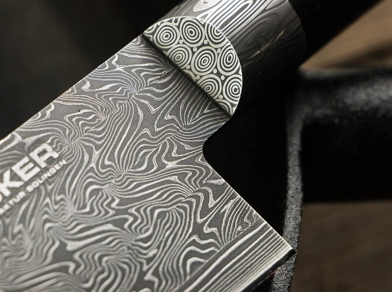Für das Böker Damast Superior kommt erstmalig ein vierbahniger Torsionsdamast (300 Lagen) mit einer separat geschmiedeten Damast-Schneidleiste zum Einsatz, den der deutsche Damastschmied Andreas Henrichs mit faszinierender Präzision exklusiv für Böker schmiedet. In einem extrem aufwändigen Verfahren werden einzelne Damaststahl-Lagen von Hand zu einem massiven Vierkantstab verschmiedet. Dieser Vierkant wird fünfzehnmal in sich verdreht, wodurch das einzigartige Muster des Torsionsdamasts entsteht. Vier dieser Stränge sowie ein fünfter aus nicht tordiertem Lagendamast werden danach feuerverschweißt und verschmiedet. Das Ergebnis ist ein Klingenrohling von außergewöhnlicher Struktur, ungeahnter Festigkeit und überragender Schneidleistung. In der Böker Messer-Manufaktur in Solingen wird aus dem Klingenrohling in über 150 Arbeitsschritten von Hand das komplette Messer gefertigt.