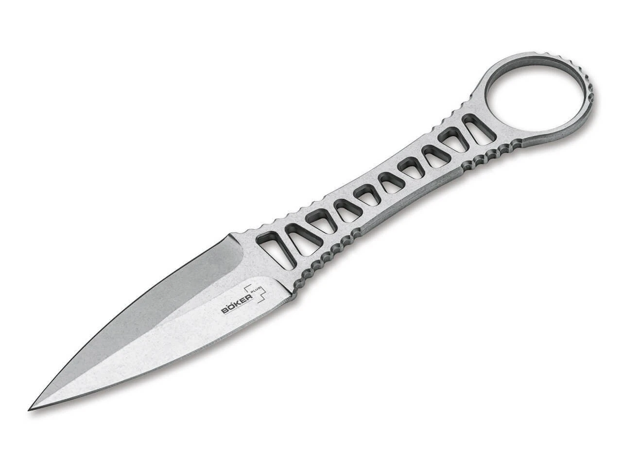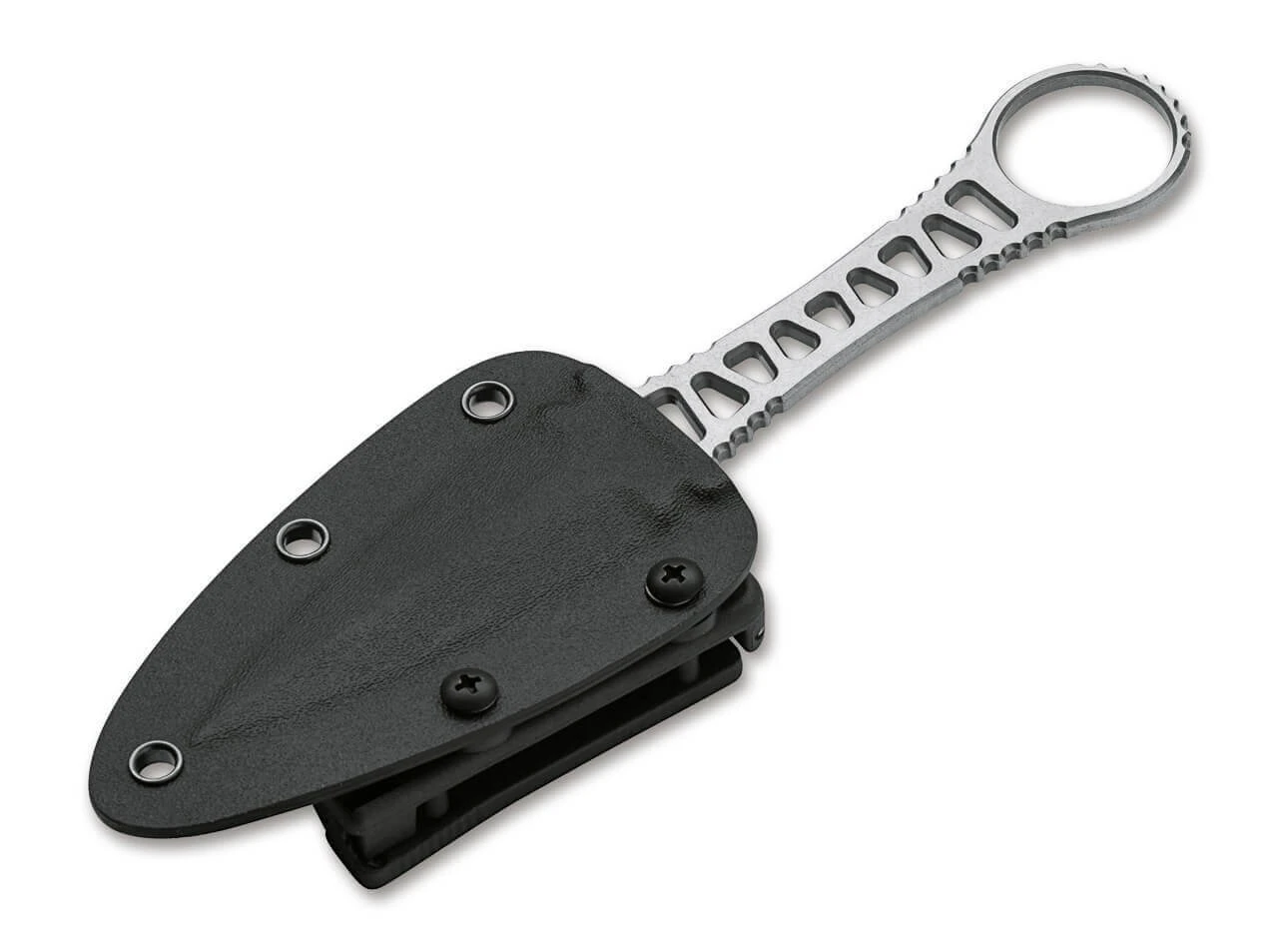 Die für Peter Fegan charakteristische Skelettbauweise verleiht dem Böker Plus Delta seine einzigartige Präsenz. Der große Griffring gewährleistet im Zusammenspiel mit den ausgeprägten Griffrillen in den relevanten Bereichen ein geradezu spektakuläres Handling, nicht nur im Standard-Griff, sondern auch im Reverse-Grip. Die beidseitig abgezogene Klinge macht das Delta zu einem Einsatzmesser auch für kritische Lagen. Getragen wird der Dolch in der im Lieferumfang enthaltenen Kydexscheide samt Gürteladapter, wobei die schlanke Bauweise und das geringe Gewicht auch einen Einsatz als Neck Knife denkbar machen. Die Ganzstahlkonstruktion besteht aus 440C und ist mit einem Stonewash-Finish versehen.