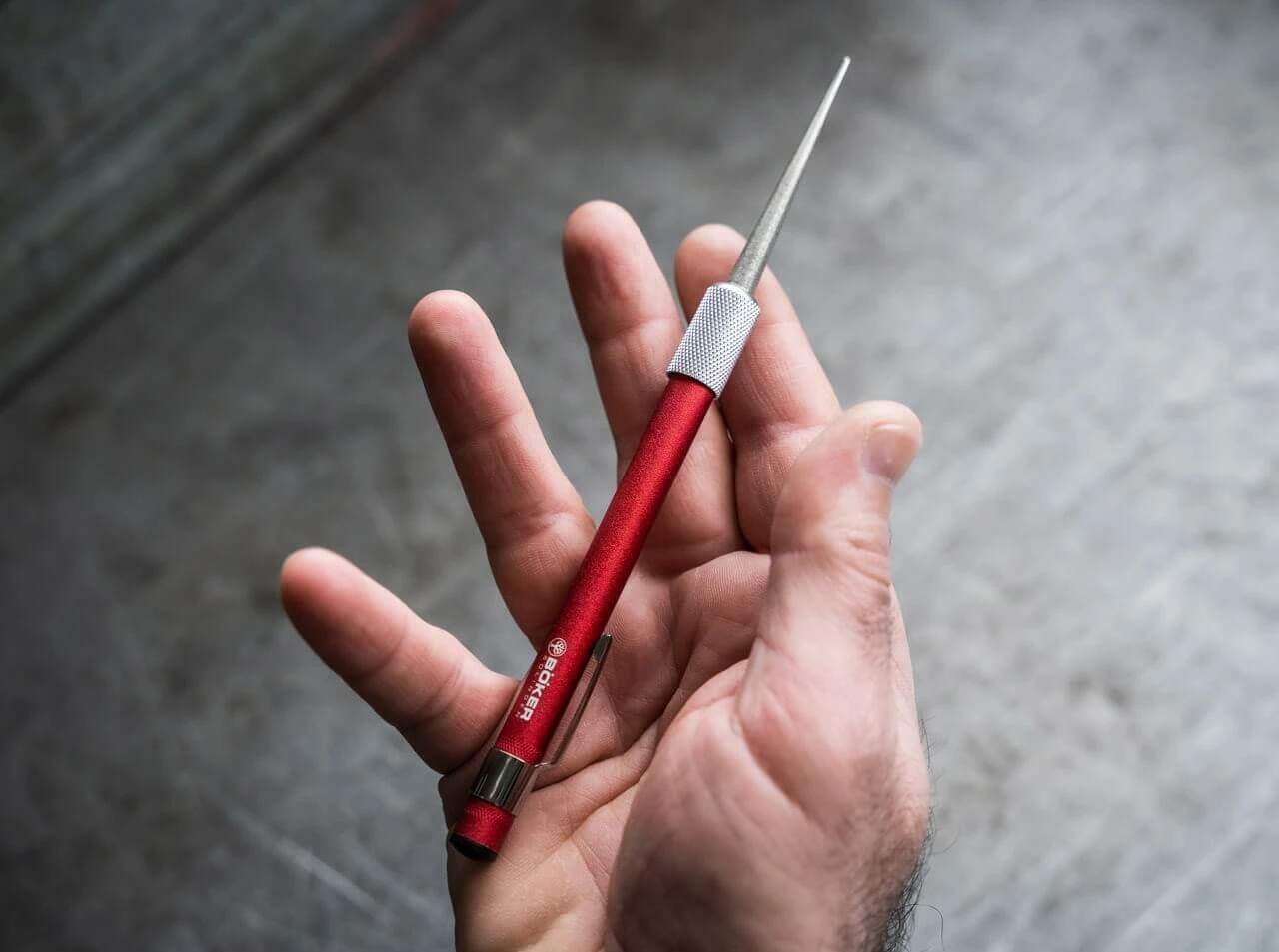 Der kleine und leichte mit Industriediamant besetzte Taschenwetzstab im Kugelschreiber-Format vereint eine konische sowie eine zylindrische Seite mit abgeflachter Anlagefläche und Angelhaken-Schärfrille auf kleinstem Raum. Die konische Seite kann für Wellenschliffe, die zylindrische für alle geraden Schliffe von Messern mit Stahlklinge verwendet werden. Die jeweils nicht genutzte Seite des Stabes verschwindet im Aluminiumgriff und wird per Überwurfmutter gesichert. Bei Nichtgebrauch kann der Stab fast vollständig im Griff versenkt und das Schärfgerät mit Federstahlclip an der Kleidung befestigt werden. Die erste und leichteste Wahl für fachmännisches Schleifen auf Rucksack-Touren.