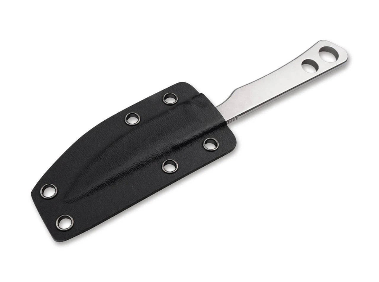 Puristisches Design und chirurgische Präzision als Ausdruck der „Haute Coutellerie“. Der französische Messermacher Charles de Buyer ist bekannt für seine Entwürfe, die auf das Wesentliche reduziert sind und gleichzeitig einen hohen Gebrauchswert versprechen. Das feststehende Messer ist als Ganzstahlkonstruktion konzipiert und weist spannende Details auf. Jimpings auf dem Rücken der schnitthaltigen D2 Klinge verbessern die Handhabung, während der Nagelhau und die ausgeprägte Fehlschärfe dekorative Akzente setzen. Der flache Griff des Gekai vermittelt ein angenehmes Gefühl in der Hand und verfügt über zwei große Aussparungen am Griffende, die Gewicht einsparen und als Fangriemenöse verwendet werden können. Lieferung mit passgenauer Kydexscheide und Gürteladapter.