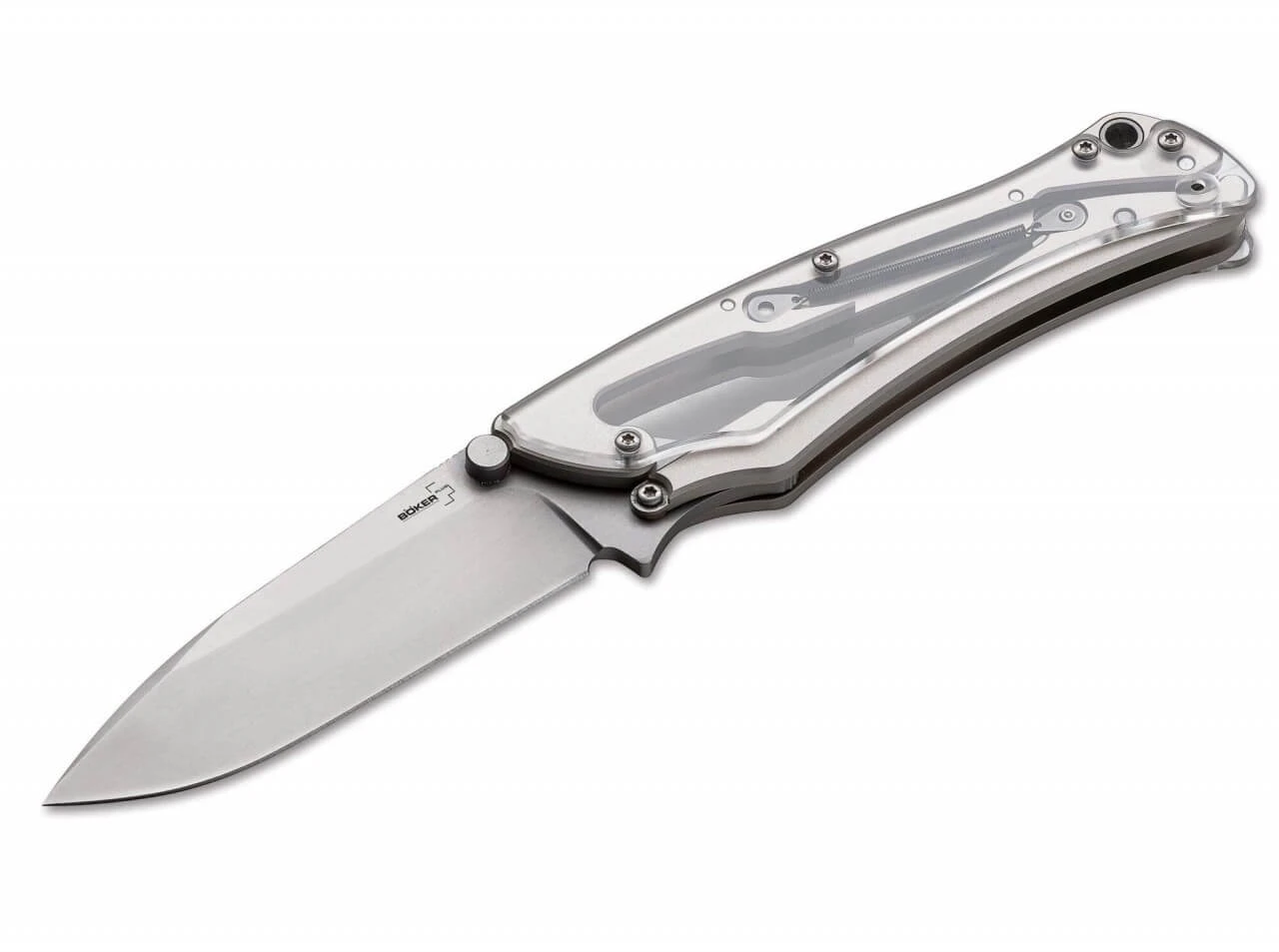 Der faszinierende Mechanismus des von Grant und Gavin Hawk entwickelten Böker Plus Griploc hat schon viele Kunden vor die Frage gestellt: „Wie geht das?“ Mit seiner transparenten Acrylgriffschale lässt sich der Mechanismus in Aktion bewundern, und es bleiben keine Fragen offen. Das Messer lässt sich bequem und federunterstützt mit einer Hand per Flipper oder Daumenknopf öffnen, hat jedoch keine automatisch greifende Verriegelung. Dennoch bietet das Griploc Clear ein Höchstmaß an Bediensicherheit, denn man hat die Möglichkeit, die Zusatzsicherung am Griffende mit der zweiten Hand zu aktivieren, die die Klinge dauerhaft offen sichert. Doch damit nicht genug: auch ohne die Aktivierung dieser Zusatzsicherung ist das Griploc im Gebrauch unbeabsichtigt kaum zum Einklappen zu bewegen: der ausgeklügelte Mechanismus der sich gegeneinander verschiebenden Griffschenkel kann seinen Totpunkt schon bei der geringsten Belastung durch die zugreifende Hand nicht mehr überwinden und verhindert ein Einklappen auch ohne Verriegelung bei normalem Gebrauch zuverlässig. Durch die genial berechneten Hebelverhältnisse reicht so schon eine minimale Haltekraft am Griffschenkel, um einer vielfach größeren, auf den Klingenrücken wirkenden Kraft standzuhalten. Zudem ziert die Schale des Griploc Clear ein Clip im Custom-Design von G&G Hawk. Beachten Sie bitte, dass die Acrylgriffschale im Alltagsgebrauch natürlich kratzempfindlicher ist als eine Aluminiumschale.
