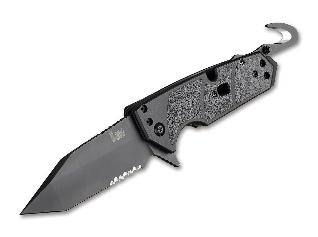 Das Heckler & Koch Karma wird von Hogue produziert und versteht sich als multifunktionales Rettungsmesser für den Notfall. Der schwarze G10-Griff liegt sowohl mit als auch ohne Handschuh sicher in der Hand. Die beschichtete Tanto-Klinge aus 154CM verfügt über einen Teilwellenschliff und wird per Flipper geöffnet. Der im Griffrücken versenkte Gurtschneider lässt sich schnell ausklappen und durchtrennt faserige Materialien sicher und mühelos. Hartmetall-Glasbrecher, Sauerstoffschlüssel im Griff und umsetzbarem Clip (Tip-up/Tip-Down) machen das Karma zur richtigen Wahl für Ersthelfer, Rettungskräfte und alle, die auf den Ernstfall vorbereitet sein wollen.