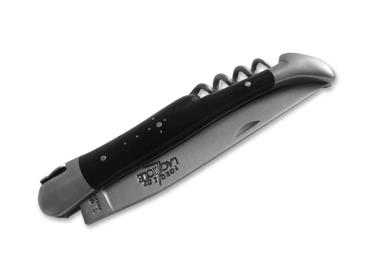 Die Heimat der weltweit bekannten Laguiole Messer liegt in Thiers, einer kleinen, seit 500 Jahren für ihre Schneidwaren berühmten Stadt in der französischen Auvergne. Ursprünglich inspiriert von Klappmessern aus Andalusien, werden dort seit Generationen die eleganten Messer mit der berühmten Biene, dem napoleonischen Wappentier, in unterschiedlichster Ausprägung gefertigt. Ideal für den täglichen Gebrauch, sind diese Messer ständige Begleiter ihrer stolzen Besitzer und verkörpern nicht zuletzt durch den typischen Korkenzieher die französische Lebensart. Der 12 cm lange Griff verwendet Schalen aus erlesenem Ebenholz und wird stilvoll von Inoxbacken eingefasst. Die einzeln geschmiedete und gehärtete Klinge aus T12 ist rostfrei und wird matt satiniert. Geöffnet wird das traditionelle Slipjoint-Taschenmesser per Nagelhau. Der Stahl weist eine Härte von 57 bis 58 HRC auf, wodurch die Klinge sehr belastbar wird und ihre Schärfe in der Regel mehrere Jahre hält.