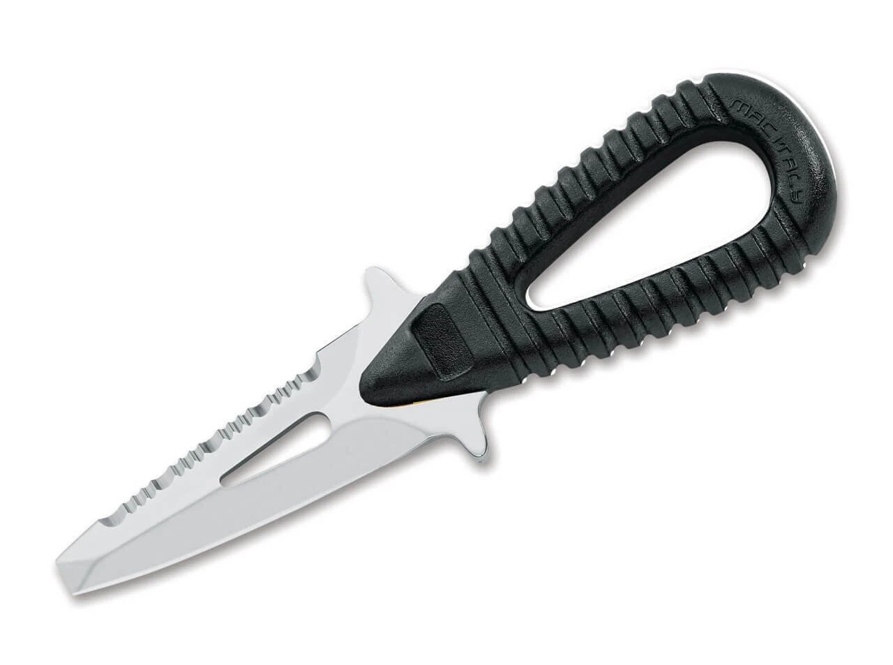Das professionelle Tauchermesser Microsub von MAC ist mit einer Klinge mit Meißelspitze aus 4116 ausgestattet, die zusätzlich über einen bissigen Wellenschliff und einen Schäkellöser verfügt. Der schwarze Griff aus rutschfestem ABS liegt auch unter Wasser sicher in der Hand. Lieferung mit Polypropylen-Scheide mit Gummibändern für Beine oder Arme. Das Messer kann aber auch als Neck Knife getragen werden.