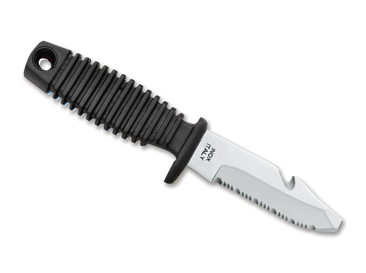 Das professionelle Tauchermesser Shark 9 PT von MAC ist mit einer Klinge aus 4116 mit Meißelspitze ausgestattet, die zusätzlich über einen bissigen Wellenschliff und einen Gurtschneider verfügt. Der schwarze Griff aus rutschfestem Polypropylen liegt auch unter Wasser sicher in der Hand. Lieferung mit PE-Scheide mit Gummibändern für Beine oder Arme.