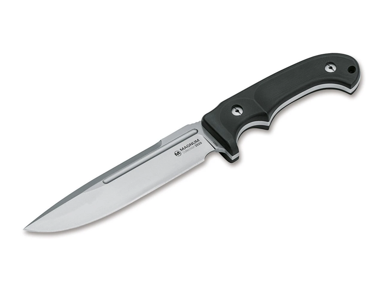 Mit der wuchtigen Spearpoint-Klinge aus fünf Millimeter starkem D2, den wir erstmals in der Magnum Collection Serie verarbeiten, gibt er dem Messer die Einsatzeigenschaften, die man von einem echten Gebrauchsmesser erwarten kann. Sie ist mit einer langen Fehlschärfe, einer ausgeprägten Hohlkehle und Riffelungen im Bereich der Daumenauflage versehen. Eine Kombination aus Stonewash– und Satin-Finish macht die Klinge unempfindlicher gegenüber Kratzern und verbessert gleichzeitig die Korrosionsbeständigkeit. Die massive Vollerlkonstruktion verleiht dem Magnum Collection 2020 sowohl die nötige Balance als auch die erforderliche Stabilität, sodass sich das Messer jederzeit zuverlässig einsetzten lässt. Die Griffschalen aus texturiertem G10 werden mittels Sandstrahl mattiert und bieten so einen eleganten Kontrast zur Klinge. Mit Fangriemenöse und schwarzen Lederscheide. Das Magnum Collection 2020 ist weltweit auf 1.999 Stück limitiert. Die Auslieferung erfolgt in einer exklusiven Sammlerschatulle und mit Echtheitszertifikat.