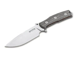 Das imposante Camp- und Outdoormesser wird sowohl dem hohen Anspruch Vitrinen-affiner Messerfreunden gerecht, als auch den Anforderungen begeisterten Outdoor-Enthusiasten. Die wuchtige Droppoint-Klinge aus D2 ist äußerst schnitthaltig und mit einem edlen Satin-Finish versehen. Die Riffelungen am Klingenrücken versprechen sicheren Halt auch bei schweren Arbeiten und die beiden Öffnungen am Handschutz erlauben ein Fixieren des Messers mit Schnur, Draht oder ähnlichem für erweiterte Outdoor-Anwendungen.