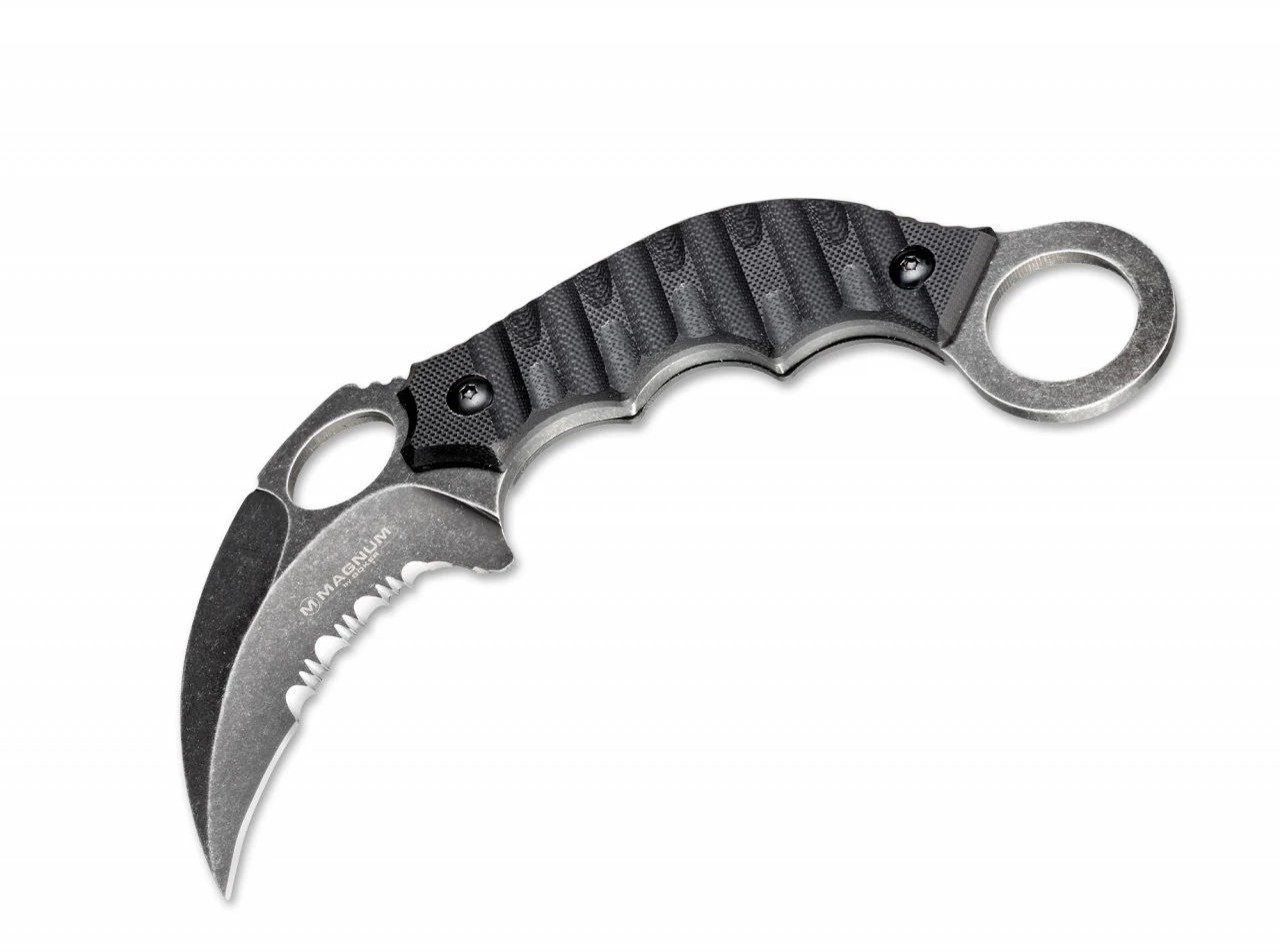 Die moderne Variante eines Karambits, auf die Anforderungen der Neuzeit ausgelegt. Die dunkle Oberfläche der Ganzstahlkonstruktion aus 440A ist mit einem scharfen, partiellen Wellenschliff versehen. Die griffig strukturierten Griffschalen aus G10 liegen extrem sicher in der Hand. Die Auslieferung erfolgt mit einer Kydexscheide und mit einer Gürtelbefestigung.