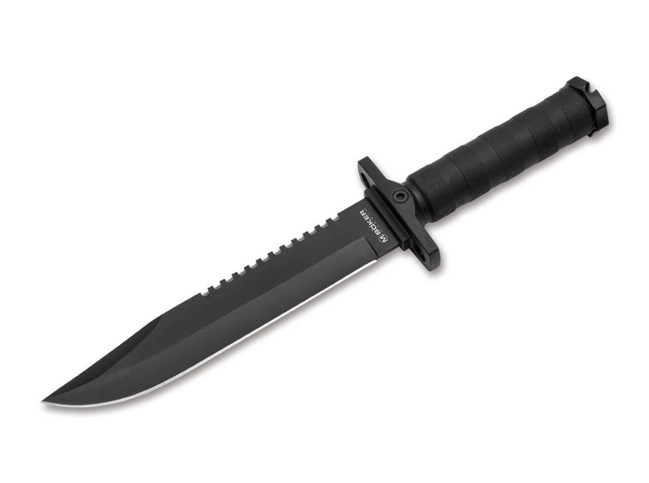 Das wuchtige Magnum John Jay Survival Knife ist ein eindrucksvolles Überlebensmesser im Sinne der von Jimmy Lile etablierten und durch den Film Rambo im Jahre 1982 weltweit bekannt gewordenen Messerklasse. Aus Stabilitätsgründen ist das Magnum JJSK allerdings nicht mit einem umstrittenen Hohlgriff ausgestattet, sondern verfügt über einen massiven Griff aus unverwüstlichem FRN. Dank der zusätzlichen Gummierung liegt der rutschfeste Griff auch bei Nässe stets sicher in der Hand, das symmetrische Parierelement erhöht die Arbeitssicherheit zusätzlich. Öffnungen im Handschutz erlauben das Fixieren des Messers mit Schnur, Draht, Kabelbinder oder Gewebeklebeband, sodass es zum Beispiel auch als behelfsmäßiger Speer eingesetzt werden kann. Die kraftvolle Bowie-Klinge aus rostfreiem und schockelastischem 7Cr17MoV ist schwarz beschichtet und zusätzlich mit der typischen Rückensäge versehen. Die passgenaue schwarze Kunststoff-Scheide bietet dank zahlreicher Öffnungen verschiedenste Befestigungsmöglichkeiten an Kleidung und Ausrüstung, während die eigentliche Gürtelschlaufe als integrierter Clip ausgeführt ist. Mit praktischer Fangriemenöse im Abschlussknauf.