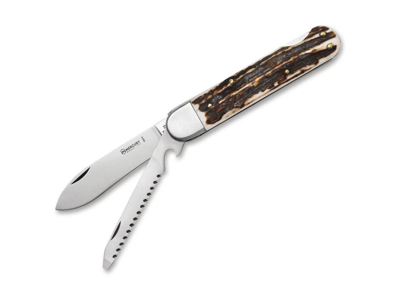 Das klassische Taschenmesser ist mit einer Klinge aus Z50CD15 ausgestattet, die per Nagelhau öffnet und mit dem sicheren Backlock verriegelt wird. Zusätzlich verfügt das Messer über eine praktische Säge. Die Edelstahlbacken bilden einen gelungenen Kontrast zu den Messingnieten in den Griffschalen aus edlem Hirschhorn.