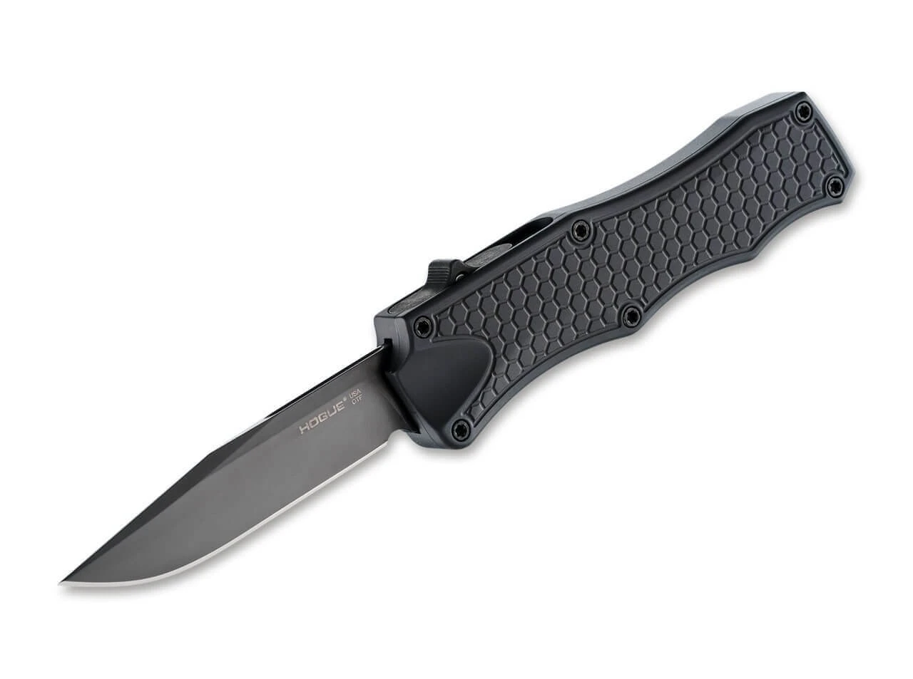 Das Hogue OTF verfügt über eine Klinge aus dem pulvermetallurgischen Hochleistungsstahl CPM-154, die sich automatisch aus dem Griff schiebt. Diese hochpräzise Mechanik zeichnet sich durch Belastbarkeit und Zuverlässigkeit aus. Das strukturierte schwarze Aluminiumgehäuse liegt sicher in der Hand.