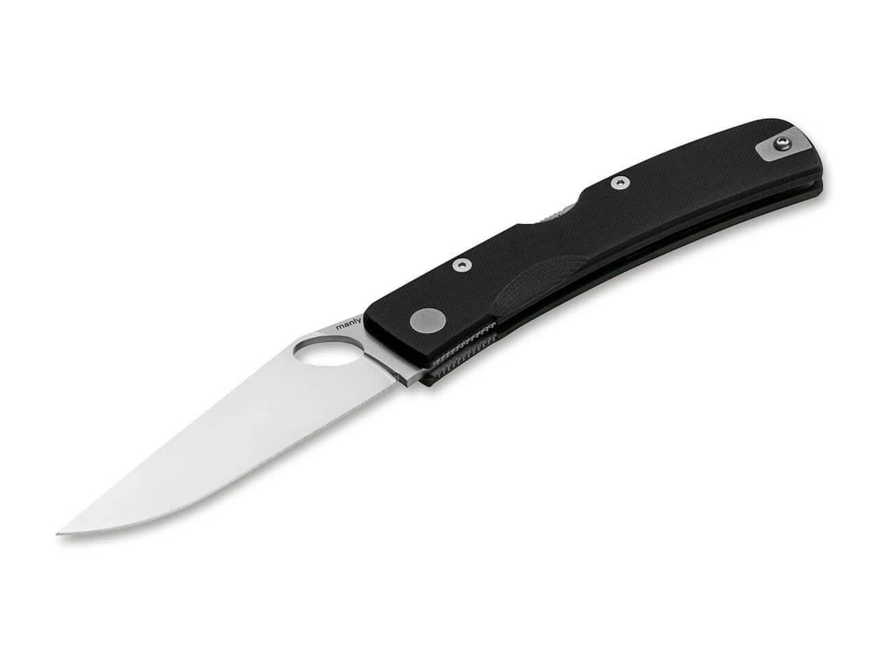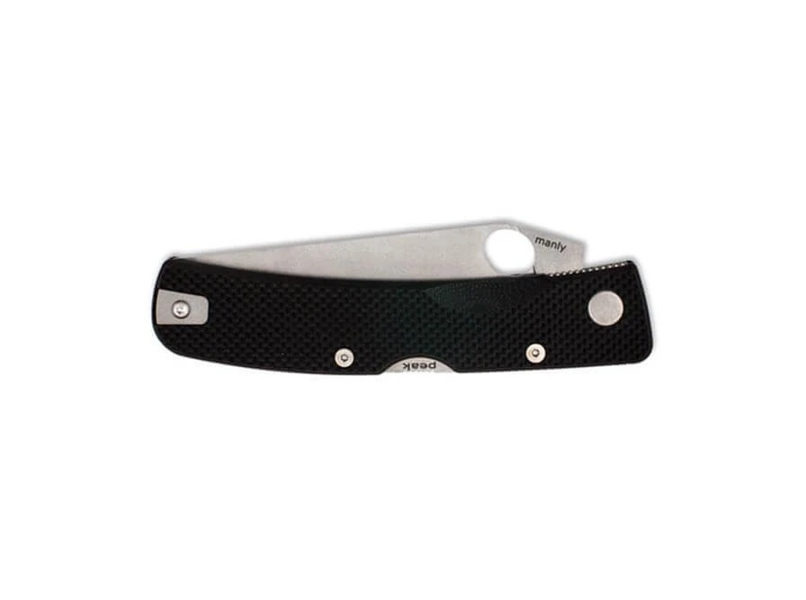 Das Manly Peak ist ein vielfältiges Taschenmesser für den Alltag, das in zahlreichen unterschiedlichen Varianten erhältlich ist. Die satinierte Klinge dieser Ausführung wird aus pulvermetallurgischem CPM-S-90V gefertigt und ist mit einer Daumenöffnung versehen. Die Verriegelung übernimmt ein stabiler Backlock. Die rutschfesten Griffschalen bestehen aus texturiertem schwarzen G10. Der umsetzbare Clip (Tip-up/l-r) ermöglicht das Tragen für Links- wie auch Rechtshänder.