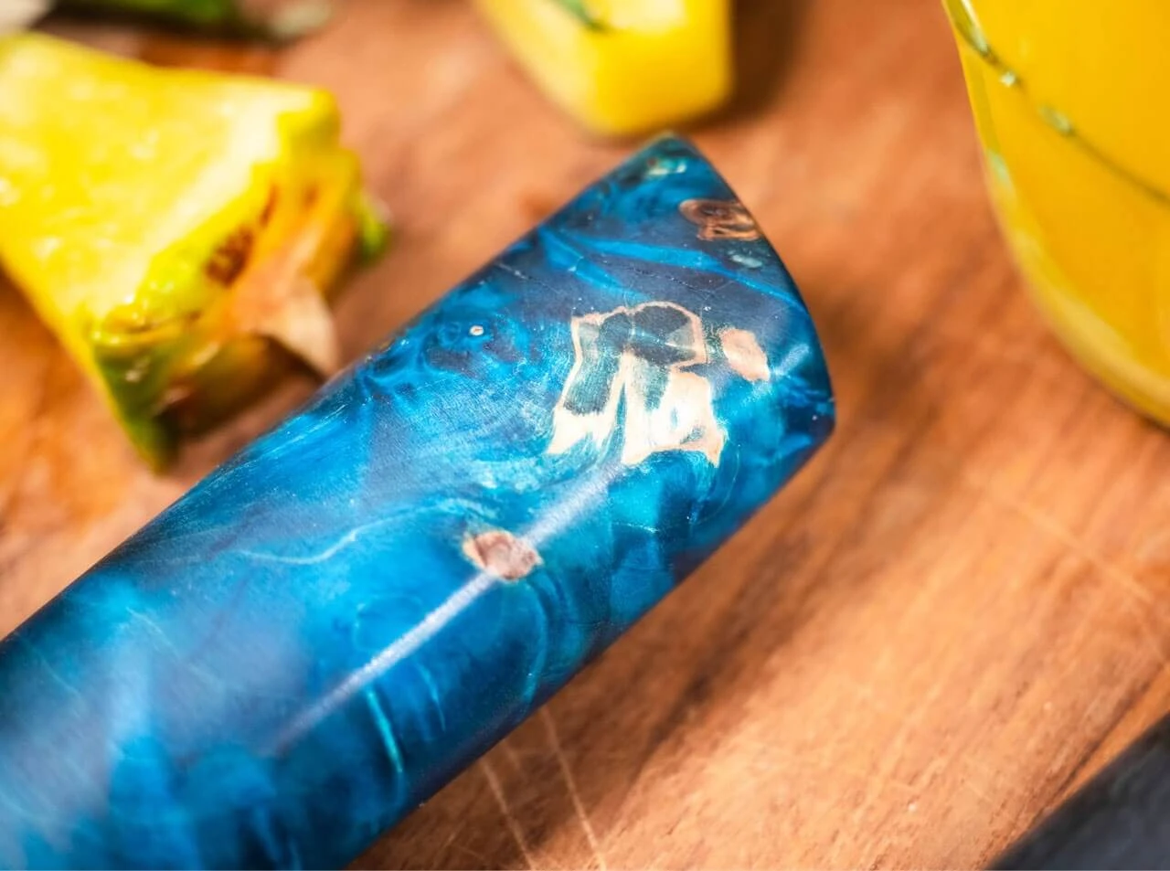 Der Griff des Böker Riviera Damast Chefmessers steht der Klinge optisch und funktional in Nichts nach. Der atemberaubende Tiefeneffekt erinnert an paradiesische Küstenabschnitte und wird durch die Stabilisation von heimischem Kastanienholz mit blauem Harz hervorgerufen. Die Auslieferung des weltweit auf nur 20 Stück limitierten Kochmessers erfolgt mit individueller Seriennummer in einer lederbezogenen Geschenkverpackung und mit Echtheitszertifikat. Handgefertigt in der Böker Messer-Manufaktur Solingen.
