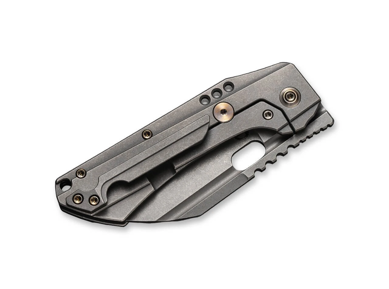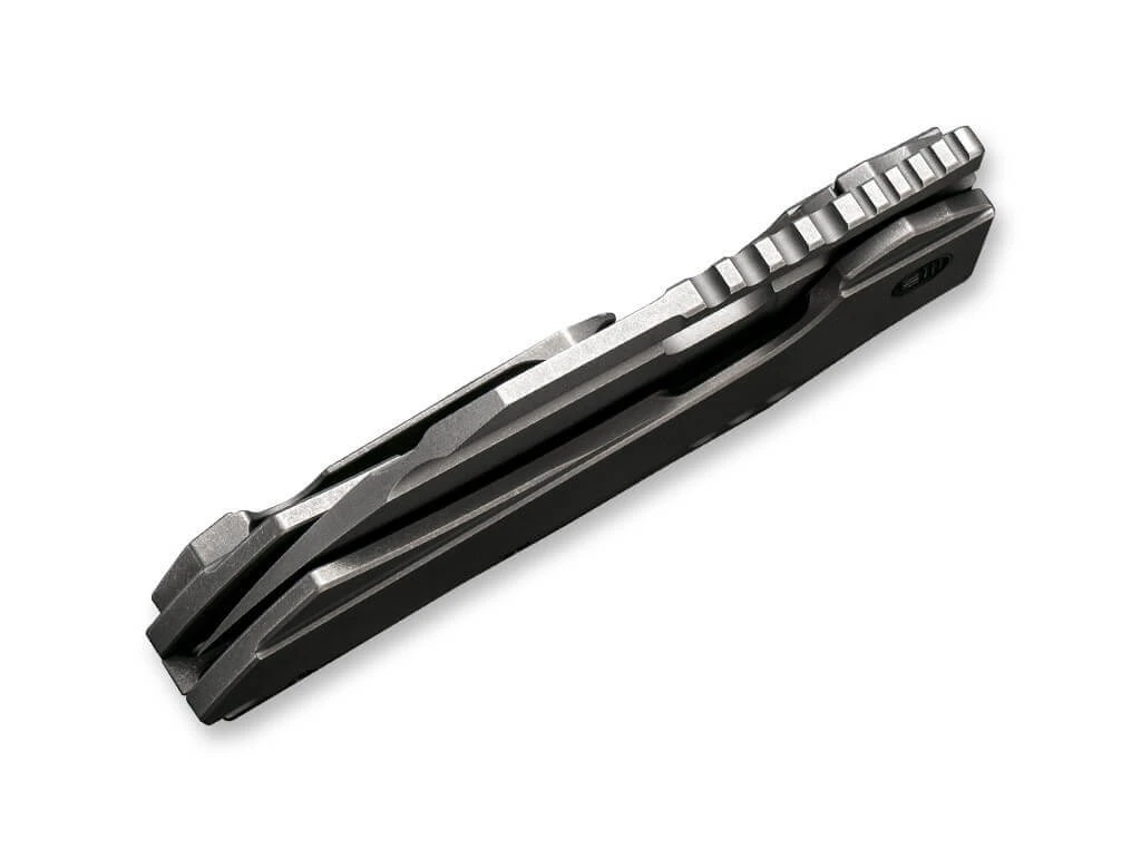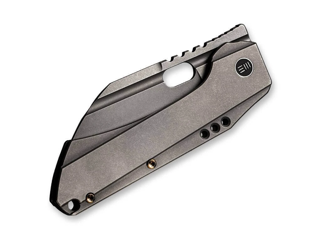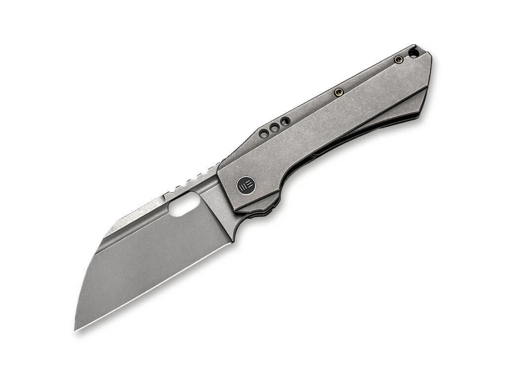 Das handfeste WE Knife Roxi lässt keine Zweifel offen und punktet mit einer Sheepfoot-Klinge aus pulvermetallurgischem CPM-S-35VN und rustikalem Titangriff in Stonewash Optik. Der alltagstaugliche Framelock Folder öffnet per Daumenöffnung und ist mit einigen Zierelementen wie einer Hohlkehle sowie gewichtssparenden Löchern im Griff versehen. Mit Fanrgiemenöse und Clip (Tip-up/r).