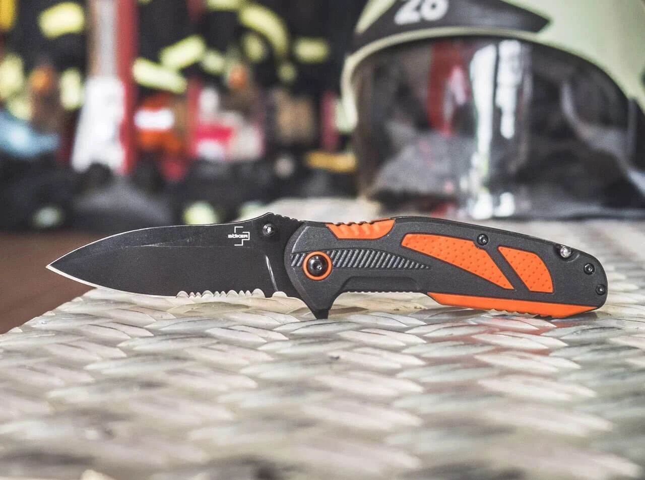 Das zuverlässige Böker Plus Savior 4 ist sowohl für den privaten Nutzer konzipiert, der sich für die Fremd- oder Eigenhilfe bei einem Unfall wappnen möchte, als auch für den professionellen Anwender, der das Messer dienstlich als Rettungswerkzeug führt. Solide Stahlplatinen tragen eine glasfaserverstärkte Kunststoffbeschalung, die an strategischen Stellen mit direkt aufgespritzten rutschfesten Gummieinlagen aus orangefarbenem TPR versehen sind. Dies gewährleistet ein sicheres Handling auch bei Nässe oder Kälte und in Stresssituationen. Der ausklappbare Gurtschneider ermöglicht das gefahrlose Kappen von Gurten auch nah am Körper. Die schwarz beschichtete Klinge des Linerlock Messers aus 12C27 öffnet per Flipper oder Daumenpin und ist mit einem praktischen Teilwellenschliff versehen. Mit hochwertigem Nylon-Gürteletui und Deep-Carry-Clip (Tip-down/r).