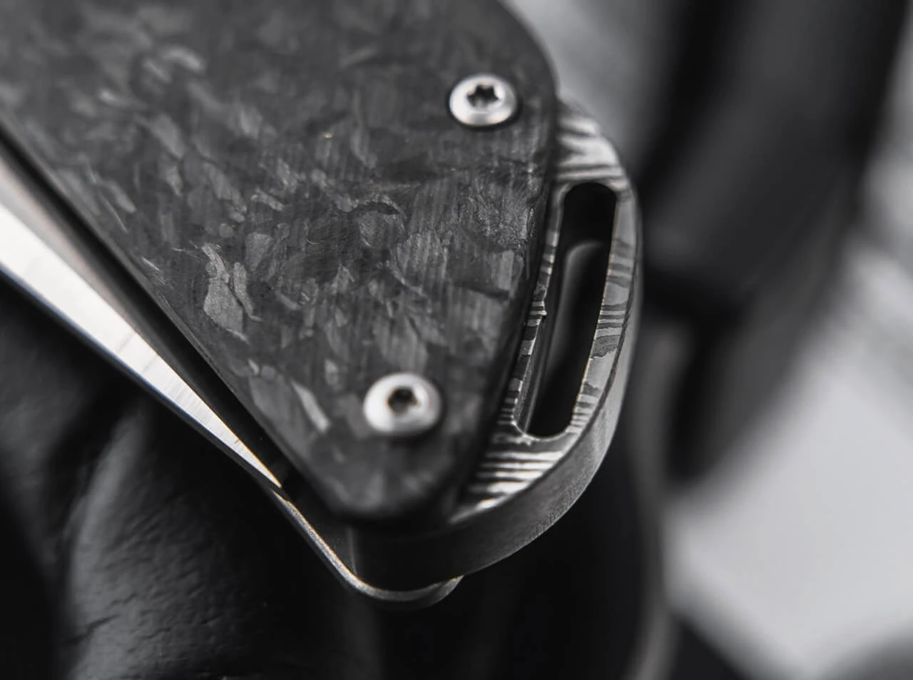 Der zentrale bauliche Unterschied zum M4-Damast-Modell ist der elegant in die Linienführung integrierte Flipper, der die Klinge mit kleinem Impuls weich aufgleiten lässt und zum Spielen einlädt. Die kugelgelagerte Klinge wird alternativ per Daumenpin geöffnet und von einem stabilen Titan–Framelock mit Stonewash-Finish arretiert, ein Overdrive-Stop fungiert als Überdehnschutz für die Verriegelung. Der gefrästem Titan–Clip (Tip-up/r) mit Stahlkugel sowie die Griffschalen aus wilder Kohlefaser vervollständigen das stimmige Gesamtbild.