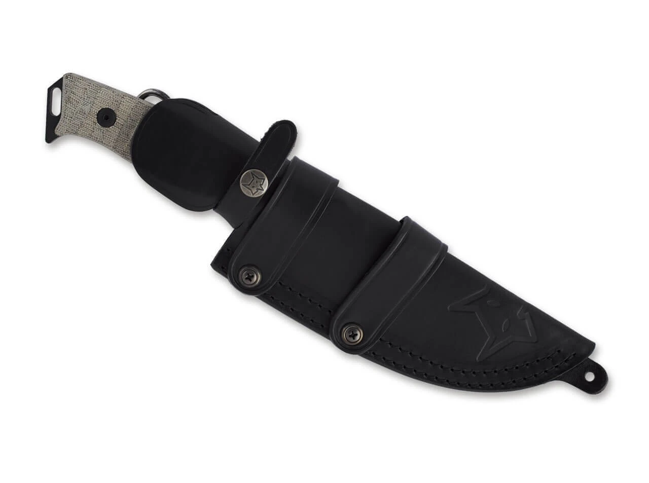 Bereit für das nächste Abenteuer? Das Fox Sherpa wartet schon auf seine nächste Expedition und definiert die Rolle des Lastenträgers völlig neu. Das Outdoormesser scheut weder Höhenluft noch Wildnis und bahnt sich dank wuchtiger D2 Klinge ungeahnte Routen. Die Klinge ist mit einer widerstandsfähigen schwarzen Idroglider-Beschichtung versehen. Orientierung gibt auch bei widrigsten Außenbedingungen der rutschfeste Griff aus texturiertem Micarta. Mit hochwertiger Lederscheide, die sowohl vertikal als auch horizontal am Gürtel getragen werden kann.