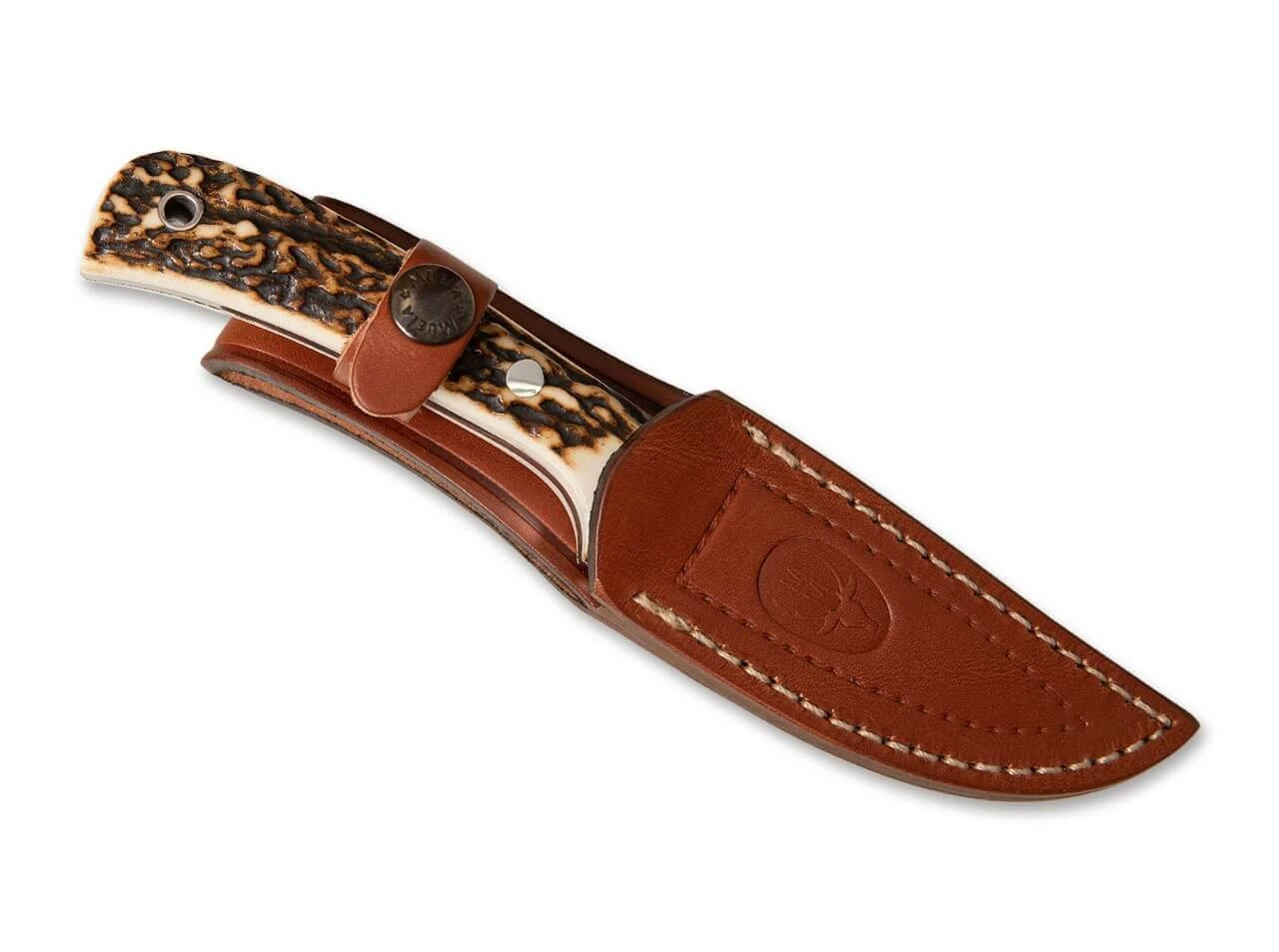 Das kompakte Jagdmesser punktet mit seiner Klinge aus Nitro-42 Stahl, welcher durch seinen erhöhten Kohlenstoff- und Stickstoffgehalt eine außerordentliche Härte mit einer hohen Korrosionsbeständigkeit vereint. Der Griff ist aus anmutigem Hirschhorn gefertigt. Mit hochwertiger Lederscheide.
