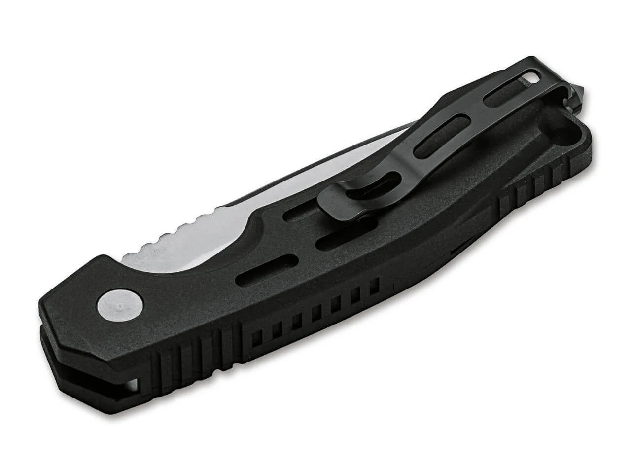 Das von Boris Manasherov entworfene Böker Plus Thunder Storm Auto ist ein stabiles Einsatzmesser, das dank der ausgeprägten Zeigefingermulde in so gut wie jeder Griffhaltung ausgezeichnet in der Hand liegt. Schnelle Griffwechsel in den Reverse-Grip oder zurück werden durch die Riffelungen am Klingenrücken und am Griff unterstützt. Die schwarzen Griffschalen werden aus Aluminium gefräst und sind mit gewichtsreduzierenden Vertiefungen versehen. Die Klinge aus AUS-8 ist mit einem Stonewash-Finish versehen und öffnet automatisch per Druckknopf. Mit Glasbrecher aus Wolframcarbid, Fangriemenöse und umsetzbarem Deep-Carry-Clip (Tip-up).