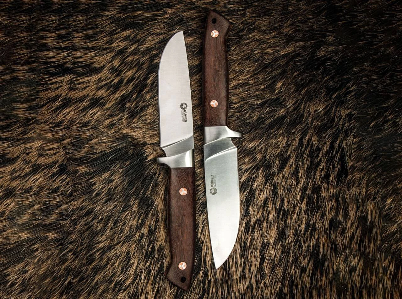 Handliches und überaus robustes Jagd- und Outdoormesser. Der hohe Flachschliff der 4,6 mm starken satinierten Klinge sorgt für ausgewogene Schneideigenschaften. Die schön geschwungene Edelstahlbacke verleiht dem Hunter eine harmonische und sehr gefällige Linienführung. Beschalung aus Guayacan–Ebenholz mit roten Fiberlagen. Klingenstahl N695. Mit Fangriemenöse. Lieferung mit brauner Köcherlederscheide.