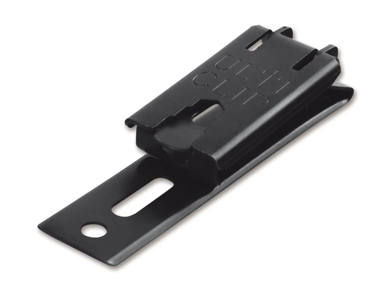Zusätzlich zum Tragen im Hosenbund oder am Taschensaum kann der etwas breiter bauende Ulticlip XL auch unter Gürteln bis 38 Millimetern Breite getragen werden und bietet in der abnehmbaren Verschlusslasche noch einen Schraubendreher und mehrere Sechskantschlüssel. Zwei Bohrungen und zwei Langlöcher zur Aufnahme von Scheiden und Holstern. Lieferung ohne Schrauben.