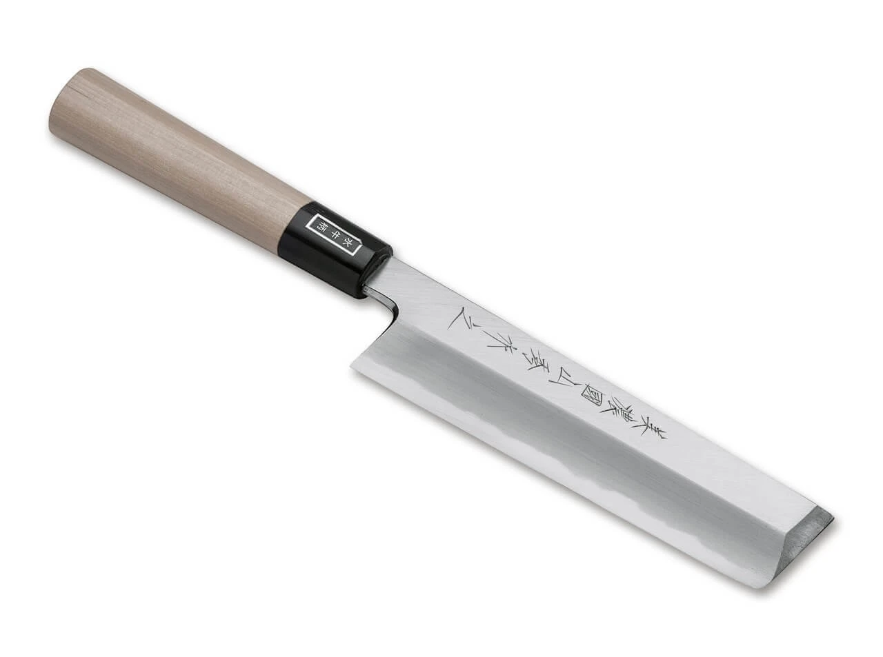 Das Usuba ist ein Gemüsemesser zum Schälen, Putzen, Zerkleinern und Hacken von Gemüse. Die feine, einseitig geschliffene Schneide ermöglicht hauchdünne Schnitte – auch für dekorative Arbeiten.