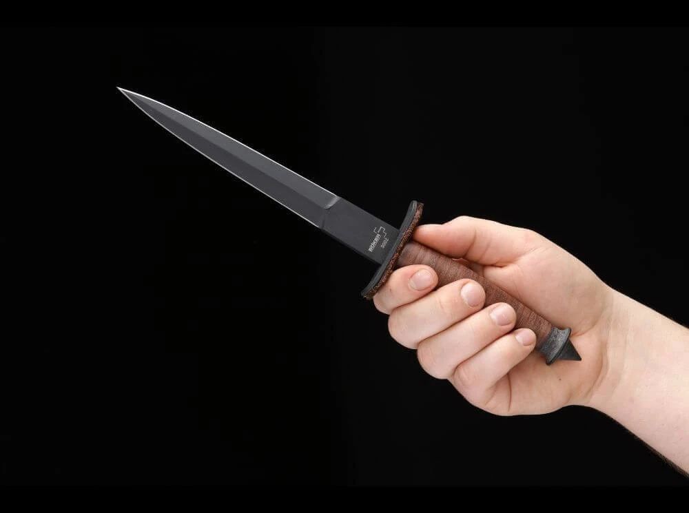 Ein wichtiger Ausrüstungsgegenstand der Devil’s Brigade war das speziell entworfene V-42 Kampfmesser, das auch Bestandteil des intensiven Nahkampftrainings war. Der Griff aus gepressten Lederscheiben läuft in einem spitz zulaufenden Schlagstück aus. Eine dünne Lederpolsterung unter dem leicht gebogenen Parierelement sollte Verletzungen beim Zustoßen verhindern. Die beschichtete Klinge aus dem nicht rostfreien Kohlenstoffstahl SK-85 ist beidseitig geschliffen und weist im Bereich des Ricasso eine geriffelte Daumenauflage auf. Noch heute ziert dieser legendäre Dolch das Wappen der Special Forces der US Army. Wir liefern dieses ausgesuchte Sammlerstück nicht nur mit der klassischen, tief sitzenden Lederscheide, sondern auch mit einer Replik des Textilabzeichens der Einheit, der roten Speerspitze, sowie mit einer Reproduktion des originalen, deutschsprachigen Aufklebers mit dem Text „Das dicke Ende kommt noch!“ samt 1st SSF-Abzeichen aus, der zur Demoralisierung nachts hinter den feindlichen Linien auf Wände, Autos, Mauern, Türen usw. geklebt wurde. Ein militärhistorisch sammelwürdiges Ensemble.